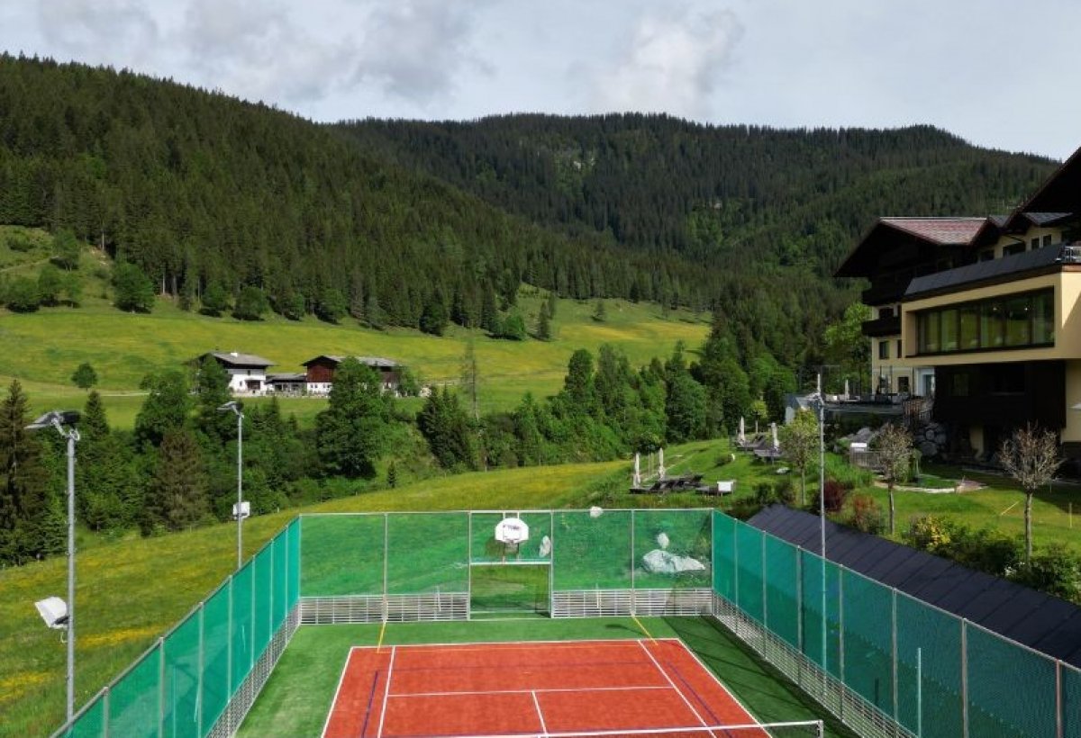 Unser großer Spielplatz mit Schaukel, Sandkasten, Klettergerüst und dem Spielhüttchen liegt direkt am Hotel. Unterhalb des Gebäudes ist der Sportplatz für Fußball und andere Funsports. Von der Terrasse aus hat man eine großartige Aussicht und die Kinder immer im Blick.