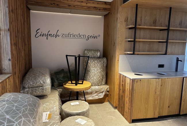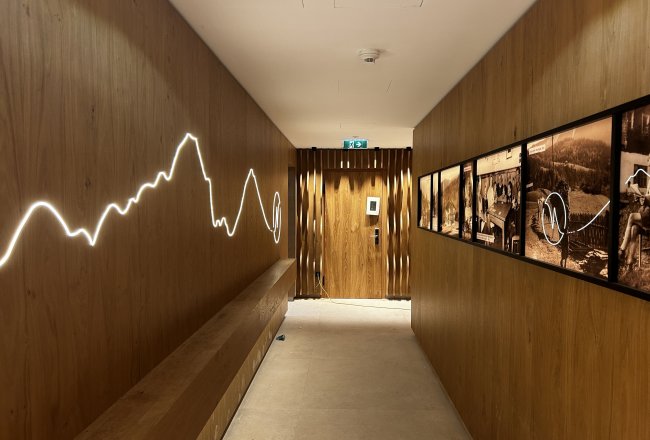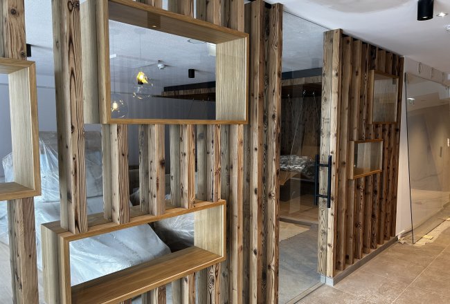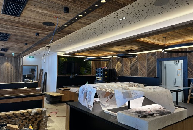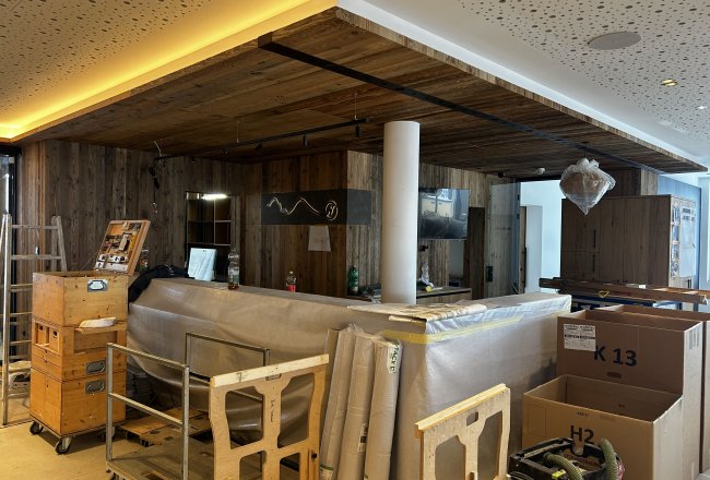 Im Inneren spürt man schon jetzt die besondere Atmosphäre. Die Rezeption und der Hotelshop werden eingerichtet, die eleganten Lamellen über der Lobby sind ein echter Hingucker und auch die Bar nimmt immer mehr Form an. Unsere Vinothek, die Hotelküche von Lohberger und die Hotelzimmer lassen bereits erahnen, wie schön alles wird.