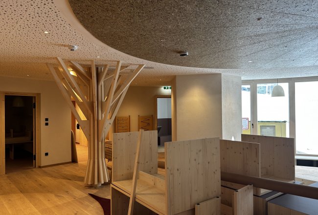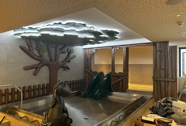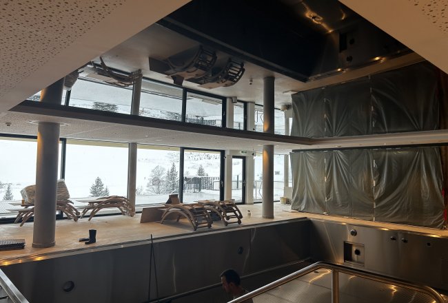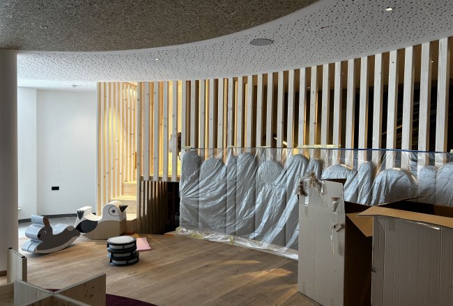 Ein Highlight: Die Panoramasauna mit traumhaftem Ausblick und auch die Umkleidespinde für unsere Day Spa Gäste sind ebenfalls in Arbeit. Auch der Kinderklub bekommt seinen Feinschliff – ein Paradies für unsere kleinen Gäste.