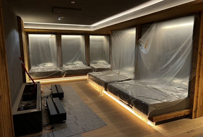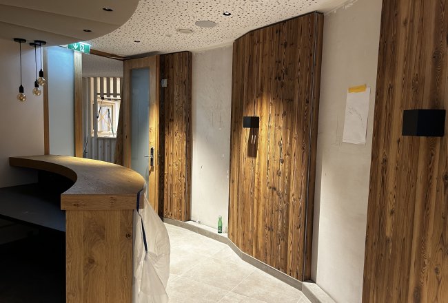 In den Zimmern sind unsere fleißigen Handwerker fast am Ziel – bis auf das Dachgeschoss sind bereits alle Türen gesetzt, und auch die Saunen im Dachgeschoss sind fertiggestellt.