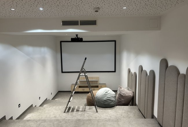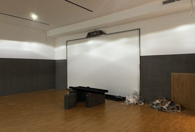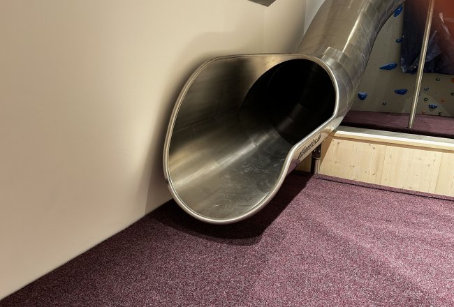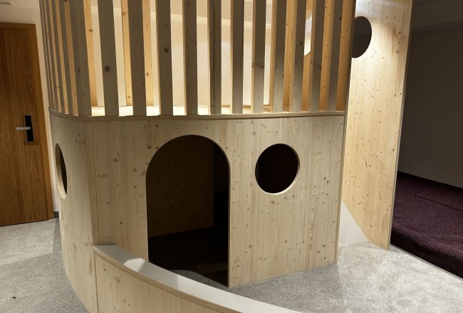 Auch im Kinderklub tut sich einiges: Die neue Kletterwand (noch abgedeckt) ist montiert und wartet schon darauf, kleine Abenteurer zum Kraxeln einzuladen. Zudem sind die ersten Möbel für den Kinderklub aufgebaut. Hier entsteht ein Ort zum Spielen, Lachen und Entdecken.