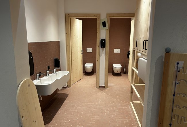 Auch im Kinderklub geht es voran: In der Toilette wurden mit den ersten Fliesenarbeiten begonnen, was dem Raum bald seinen fröhlichen und kindgerechten Look verleihen wird.