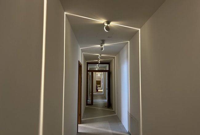 Im Erdgeschoss wurden bereits die Decken abgehängt, was nicht nur für eine moderne Optik sorgt, sondern auch die technische Infrastruktur elegant verbirgt.