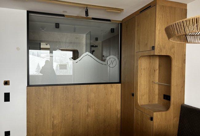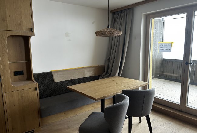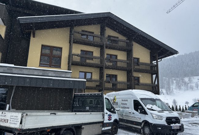 Im Inneren schreitet der Ausbau ebenfalls zügig voran. Die ersten Holzböden werden bereits verlegt, was eine wohnliche Atmosphäre entstehen lässt. Parallel dazu hat die Firma Voglauer ihre Arbeiten aufgenommen und mit der Montage der Inneneinrichtung begonnen – ein bedeutender Meilenstein im Innenausbau.